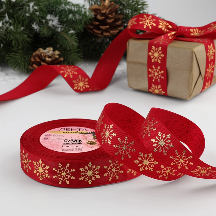 Лента репсовая с тиснением «Снежинки», 25 мм, 23±1 м, красная, золотой №1133