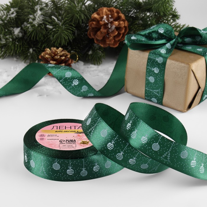 Лента атласная «Ёлочные игрушки», 25 мм, 23±1 м, тёмно-зелёная №49
