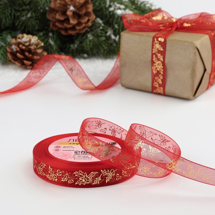 Лента капроновая с тиснением «Омела», 15 мм, 23±1 м, красная, золотая