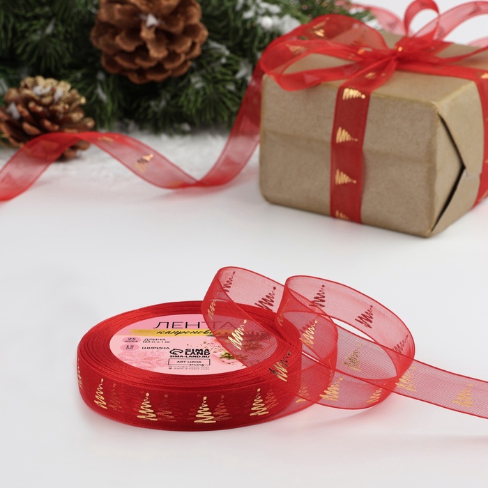 Лента капроновая с тиснением «Ёлки», 15 мм, 23±1 м, красная, золотая