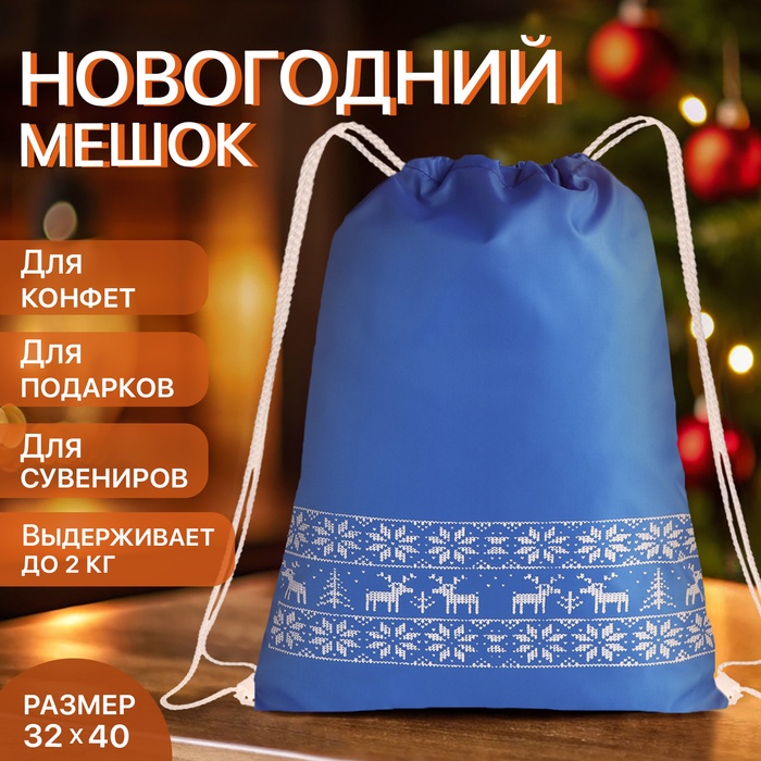 Мешок для подарков новогодний на шнурке "Олени", цвет голубой