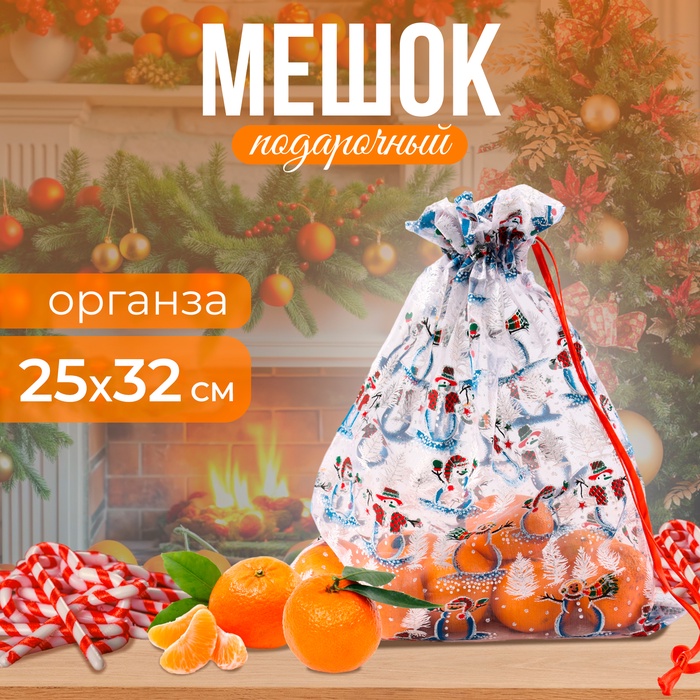 Новогодний мешок «Снеговики с ёлками», р. 25 × 32 см, органза