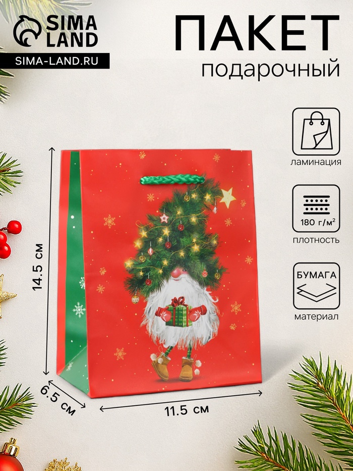 Пакет подарочный "Новогодний домовёнок", 11,5 х 14,5 х 6,5 см.