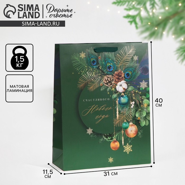 Пакет подарочный новогодний ламинированный «Малахит», L 31 х 40 х 11.5 см