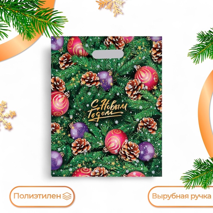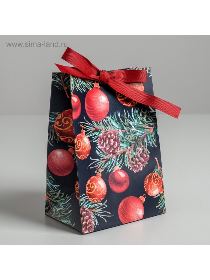 Пакет подарочный новогодний с лентой «Ёлочные игрушки», 13×19×9 см