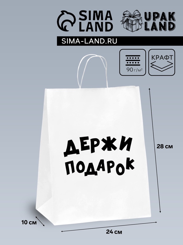 Пакет подарочный с приколами, крафт «Держи подарок», белый, 24×10×28 см