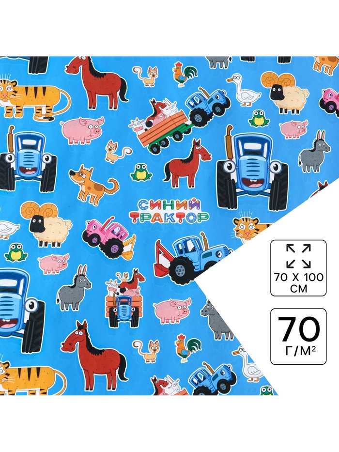 Бумага упаковочная глянцевая, Синий трактор, 70×100 см