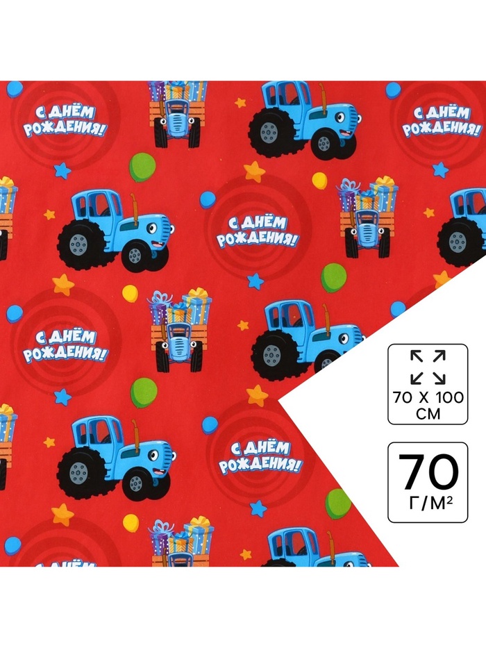 Бумага упаковочная глянцевая, «С днём Рождения», Синий трактор, 70х100 см