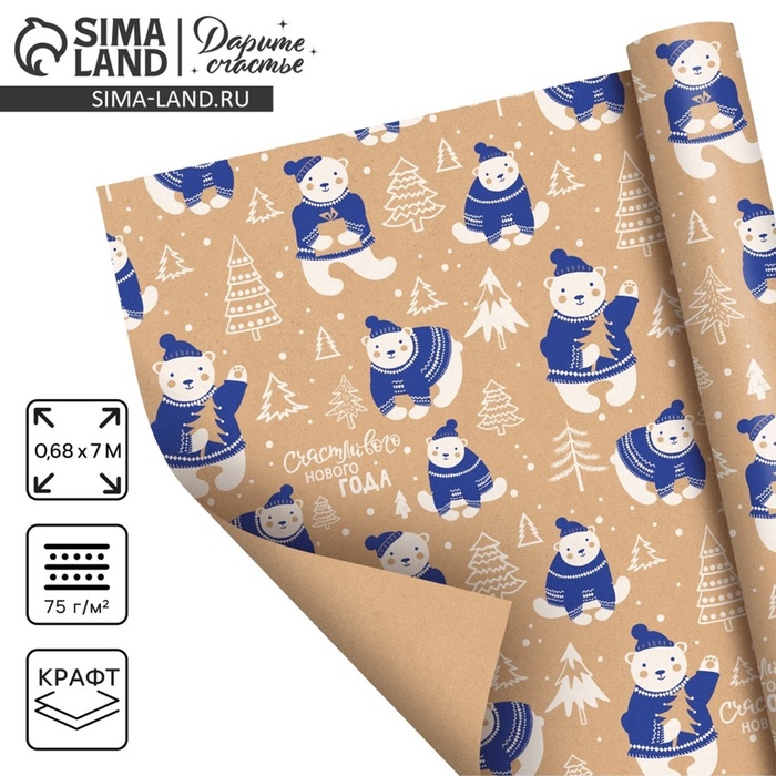 Бумага упаковочная крафтовая «Полярные мишки», 0.68×7 м