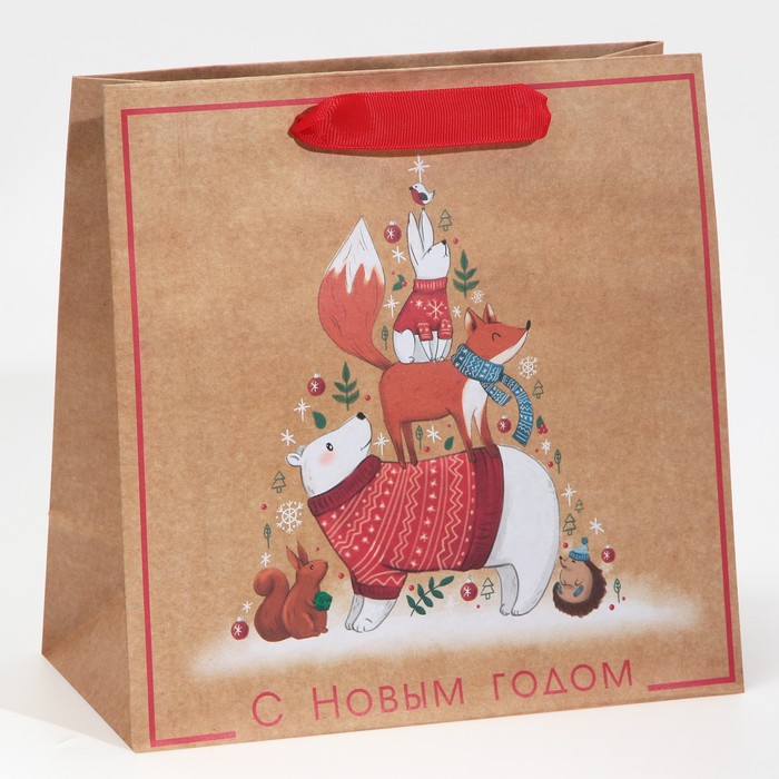 Пакет подарочный новогодний крафтовый квадратный «Друзья», 22×22×11 см