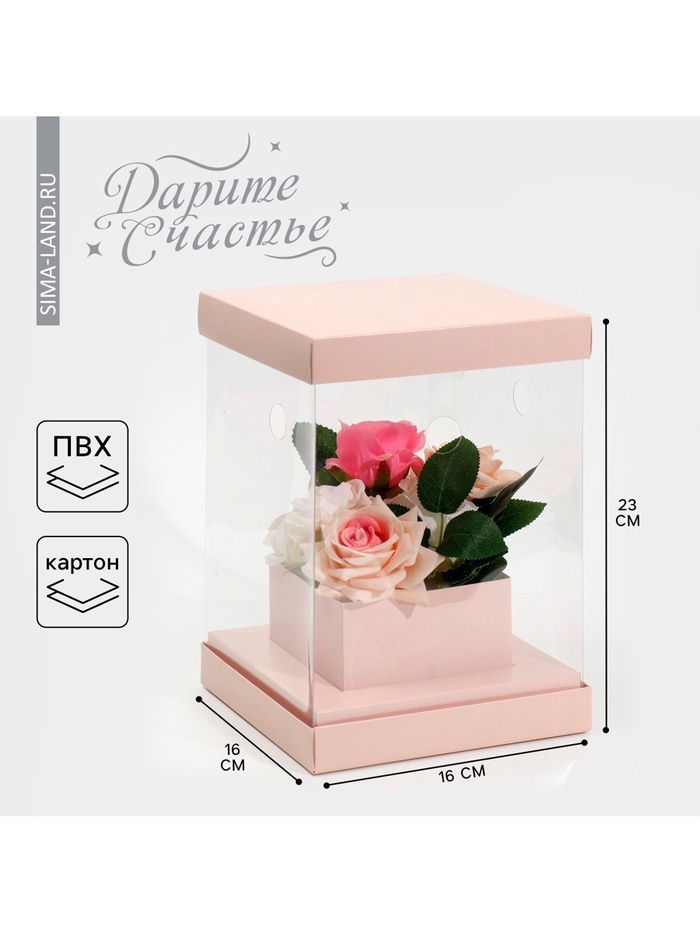 Коробка подарочная для цветов с вазой и пластиковыми окнами складная, упаковка, «Бежевая», 16 х 23 х 16 см