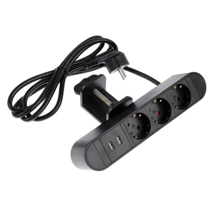 Удлинитель на струбцине Luazon, 16 А, трёхместный, 2xUSB, 2.1 A, провод 1,8 метра, черный