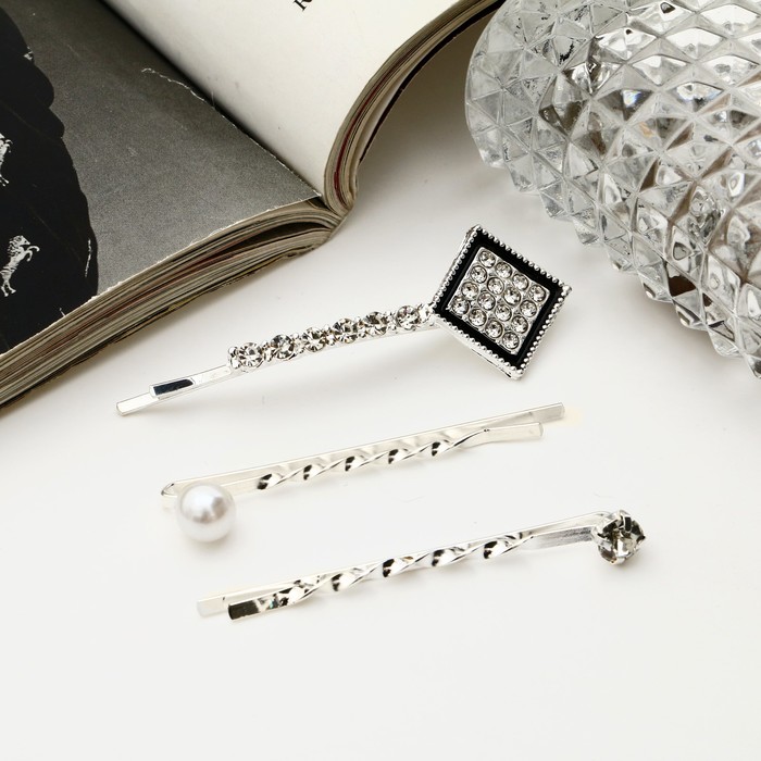 Невидимки для волос «Альтаир», набор 3 шт., ромбик, 5.5 см, серебро