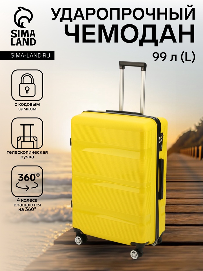 Чемодан на колёсах большой 99 л (L), на молнии, кодовый замок, 4 колеса, жёлтый
