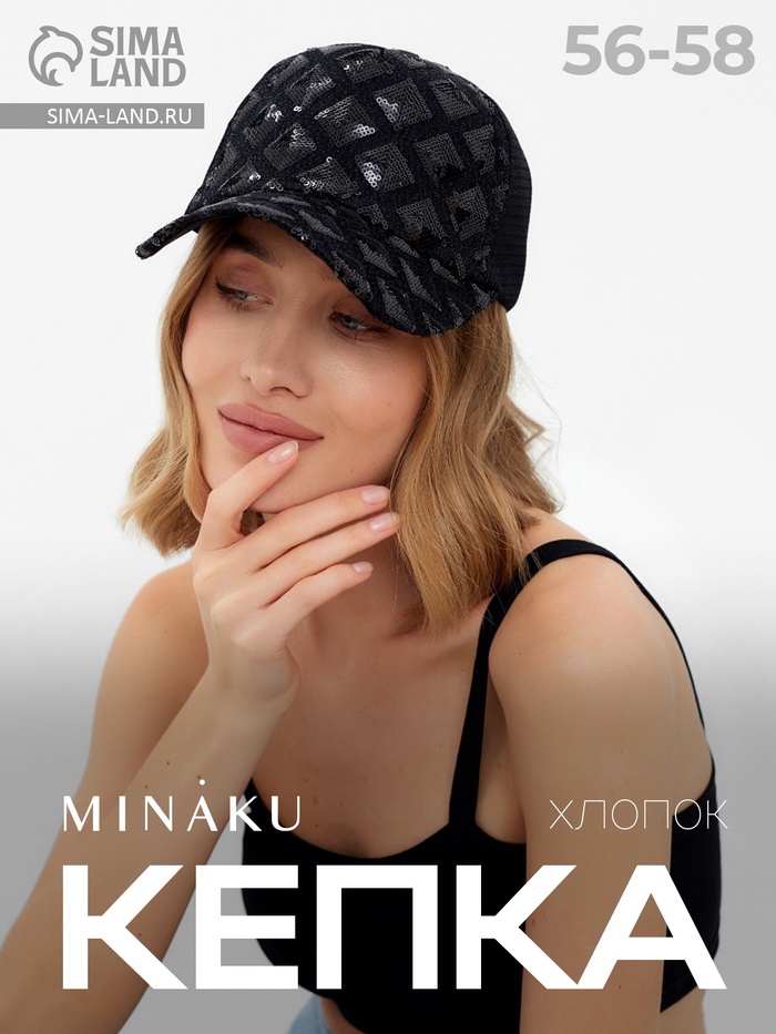 Кепка женская MINAKU с блестящими вставками, чёрная, размер 56-58