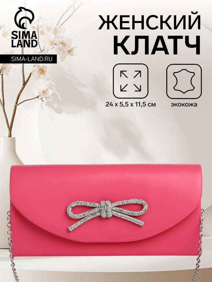 Сумка-клатч женская вечерняя на магните, на длинной цепочке, с декоративным бантом, розовая