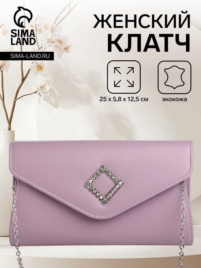 Сумка-клатч женская вечерняя на магните, на длинной цепочке, с декоративным элементом, однотонная, фиолетовая