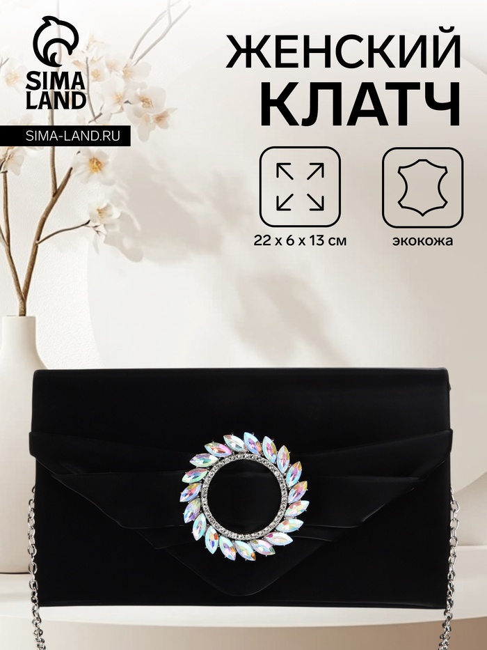 Сумка-клатч женская вечерняя на магните, на цепочке, с декоративной пряжкой, чёрная