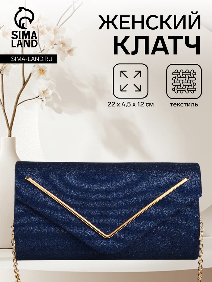 Сумка-клатч женская вечерняя на магните, на золотистой цепочке, тёмно-синяя