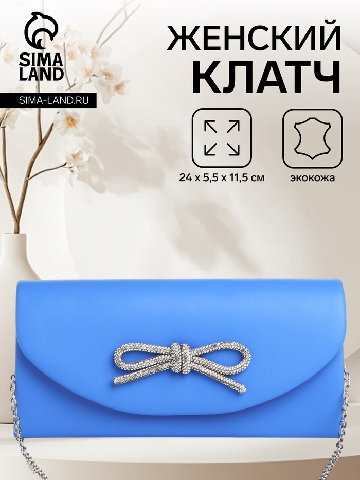 Сумка-клатч женская вечерняя на магните, на длинной цепочке, с декоративным бантом, синяя