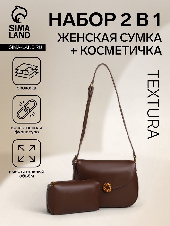 Сумка женская мессенджер TEXTURA на магните, с косметичкой, 28×4×20 см, коричневая