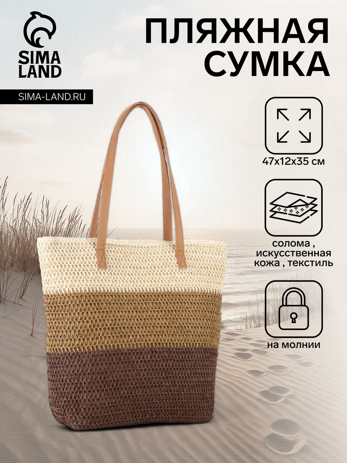 Сумка пляжная на молнии, на подкладке, 47×12×35 см, бежевая/коричневая