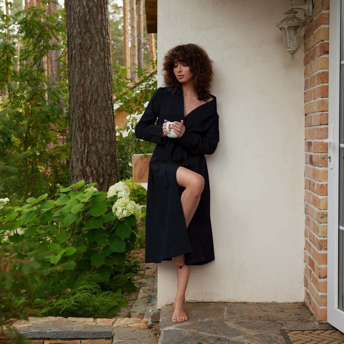 Халат вафельный женский удлинённый Экономь и Я размер 50-52, цвет чёрный, 100% хлопок, 200г/м2