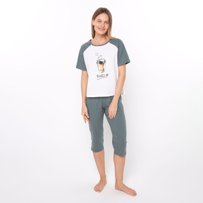 Пижама женская (футболка, бриджи) Wake up, серо-зелёная, размер 46