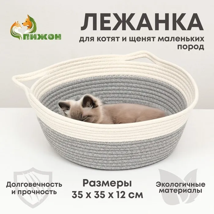 Экологичный лежак для животных (хлобчатобумажный), 35 х 35 х 12 см, вес до 5 кг, бело-серый