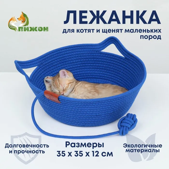 Экологичный лежак для животных (хлобчатобумажный), 35 х 35 х 12 см, вес до 5 кг, синий