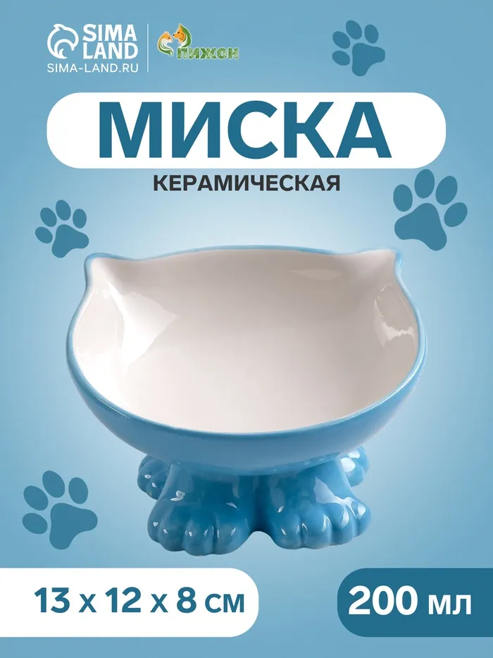 Миска керамическая "Киса" на подставке-лапках 200 мл голубая/белая