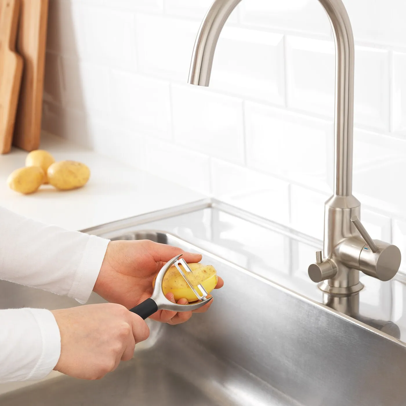 Используйте острую кромку для удаления дефектов/глазков с картофеля.