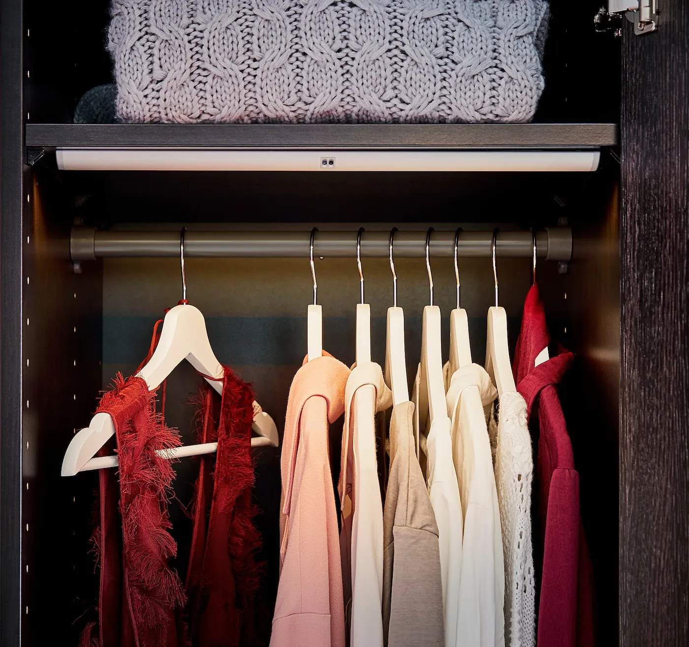 Необходимый элемент для любого гардероба — развешивание одежды избавляет от складок и помогает легко подобрать наряд с утра. Сортировка по цвету или стилю тоже может быть полезной.
