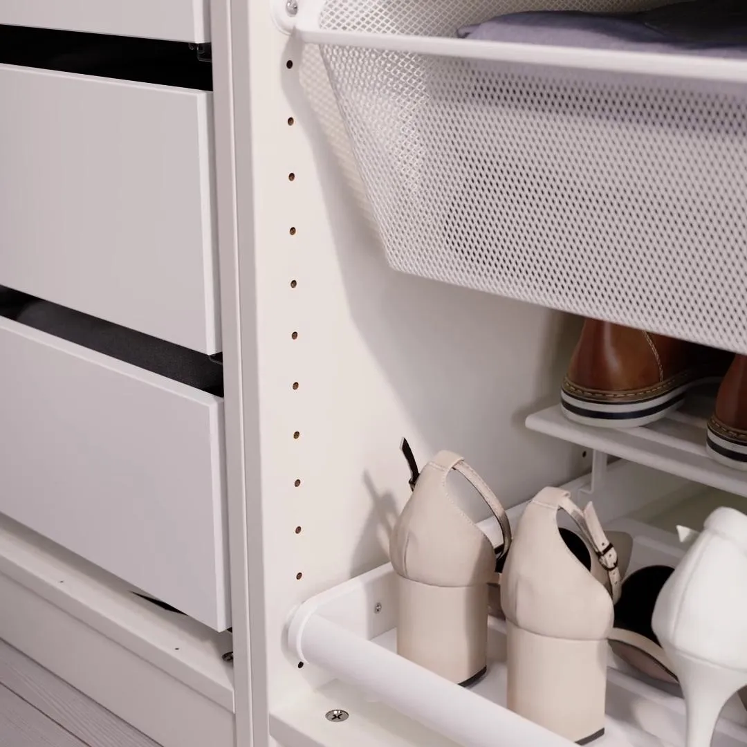 Не нужно лезть вглубь шкафа в поисках обуви – эта полка сама выдвинется к вам. Металлическая конструкция подходит как для дизайнерских туфель на шпильке, так и для походных ботинок.