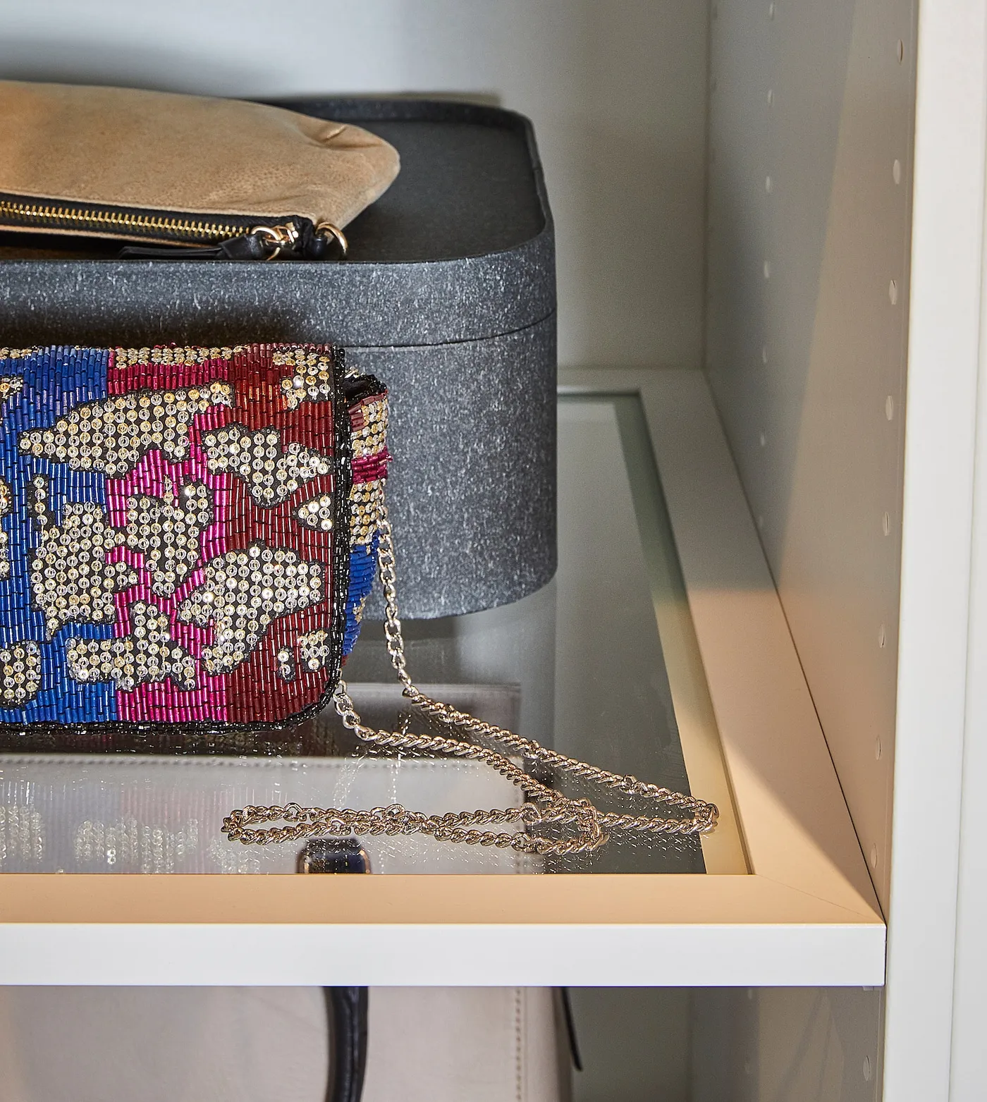 Если разместить стеклянную полку выше в гардеробе, будет легче следить за содержимым в глубине.