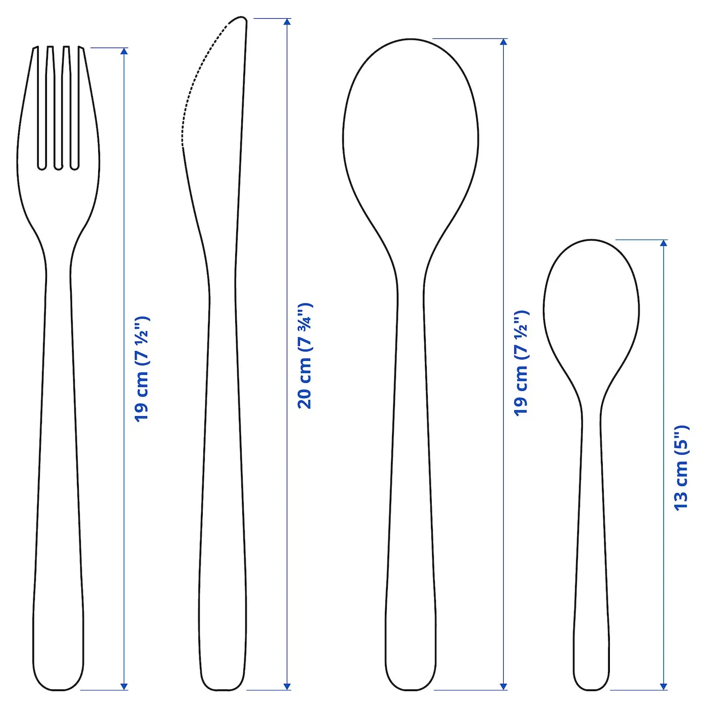 Включает: 4 вилки, ножи, ложки и чайные ложки каждого вида.