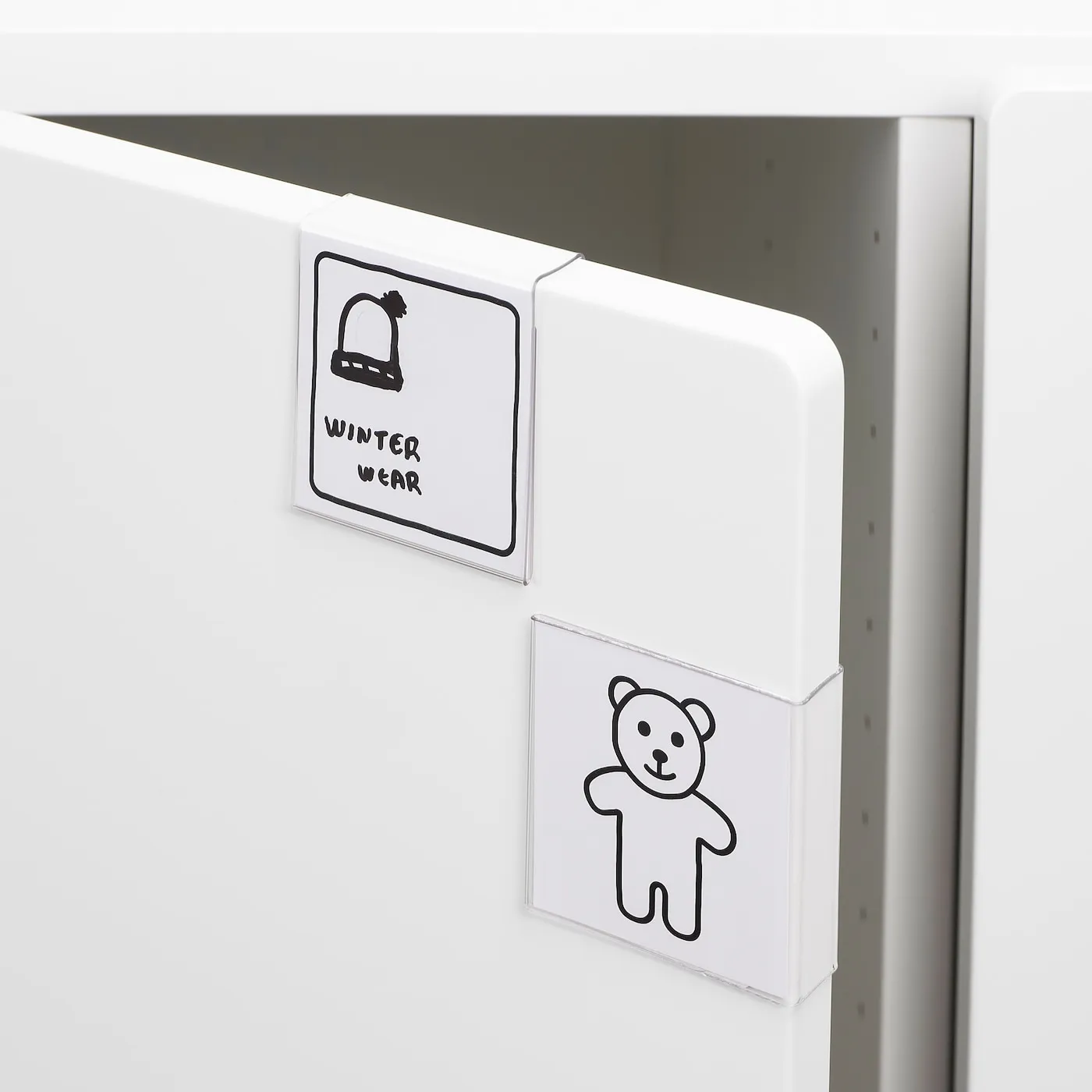 Превратите уборку в игру — с помощью изображений в одном или нескольких держателях для этикеток можно легче навести порядок и детям, и взрослым в ящиках и шкафах.