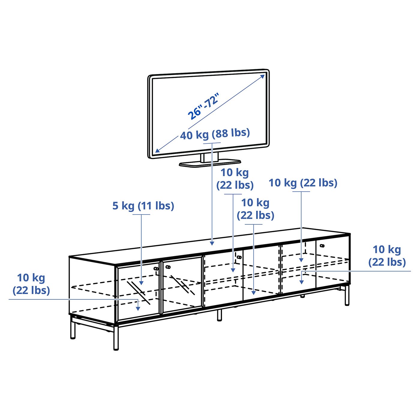 Мы рекомендуем, чтобы ТВ-тумба была немного шире телевизора, установленного на ней. Эта ТВ-тумба подходит для телевизора до 72 дюймов. Вы можете выбрать телевизор большего размера, если его вес не превышает допустимую нагрузку для верхней панели тумбы.