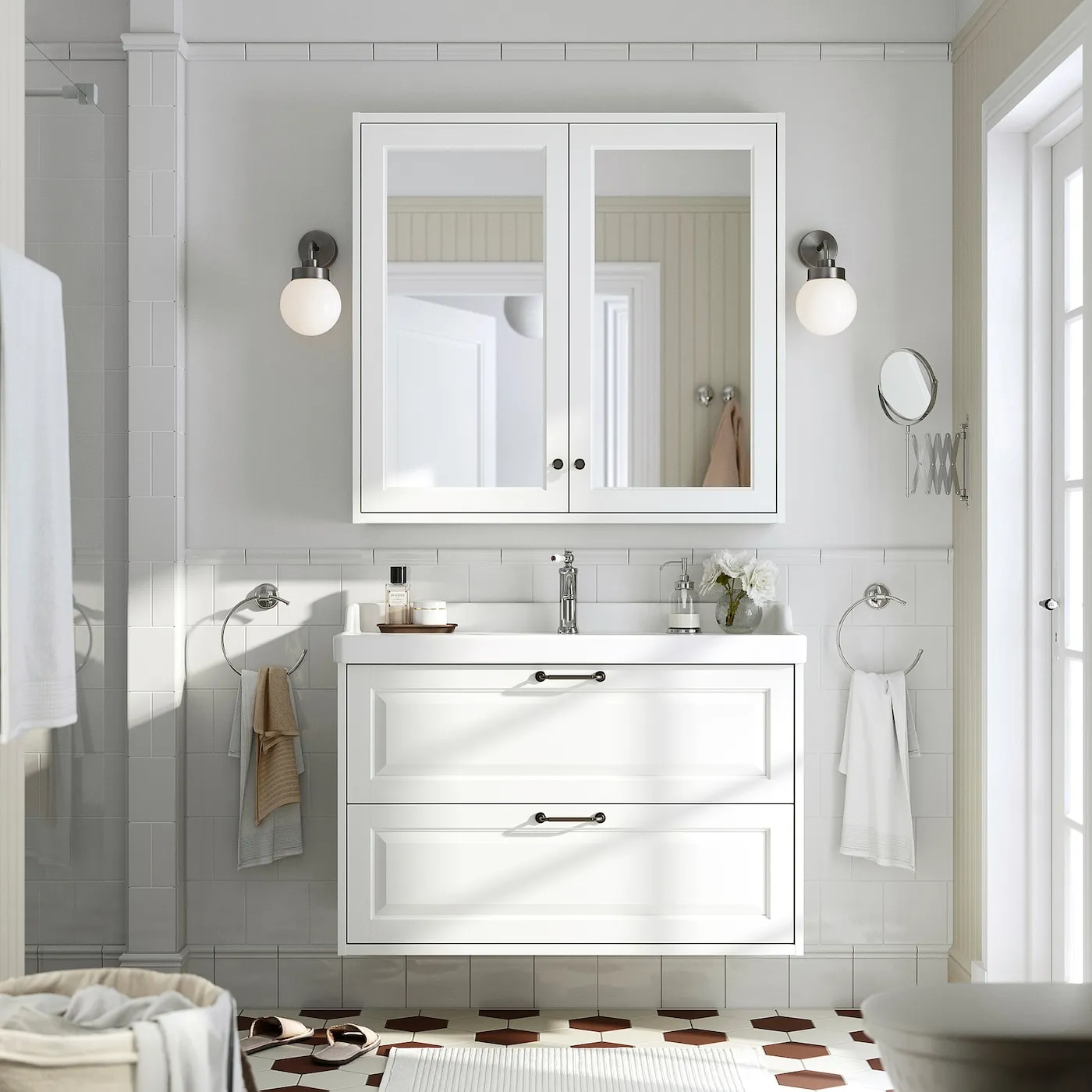 Классические детали, такие как скошенные панели, придают стиль коллекции для ванной TÄNNFORSEN. Этот неглубокий шкаф с зеркалом поможет подготовиться к новому дню, не занимая много места.
