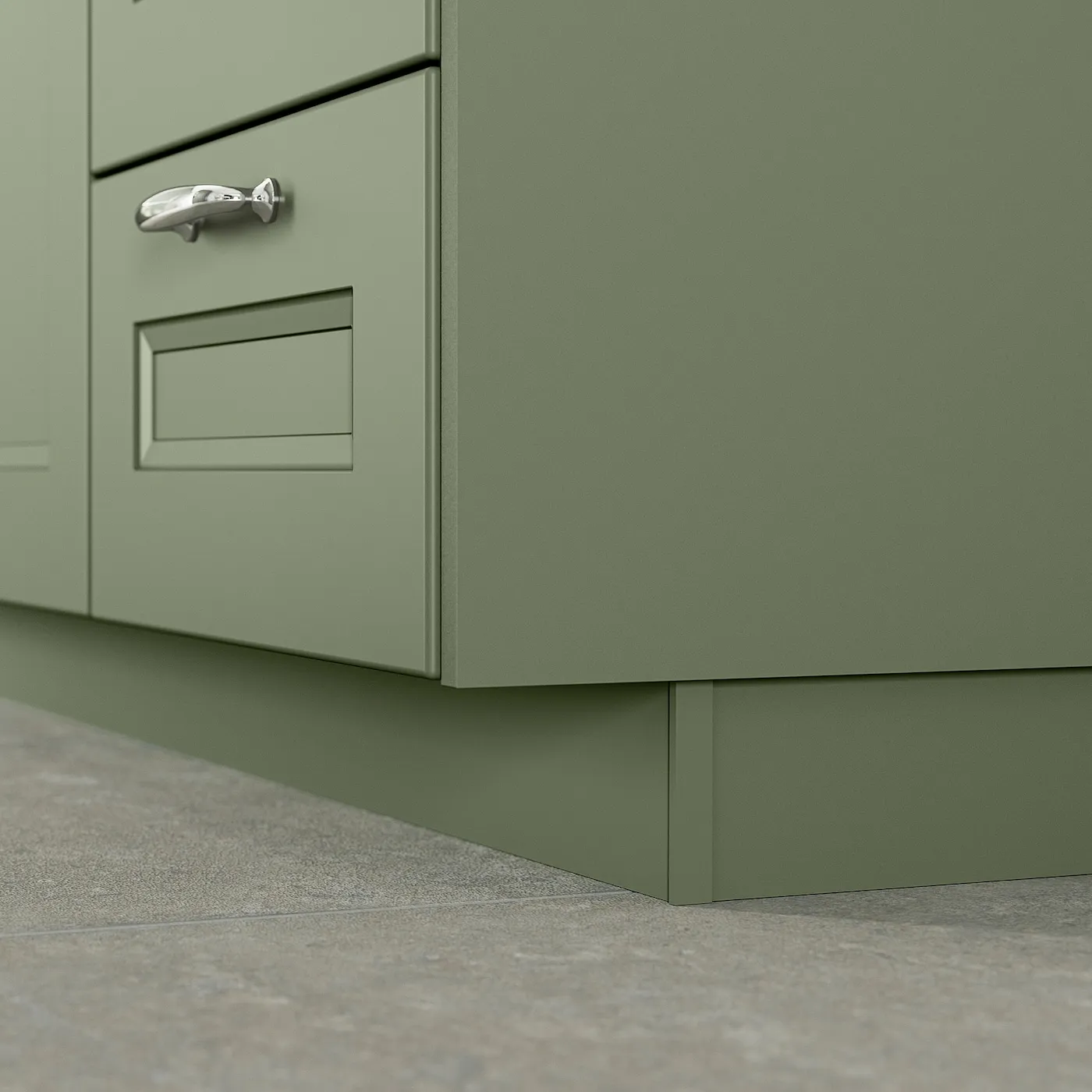 С цоколями в том же гармоничном матовом серо-зеленом оттенке, что и ваши фасады, кухня приобретает единообразный вид и подчеркнутый стиль.