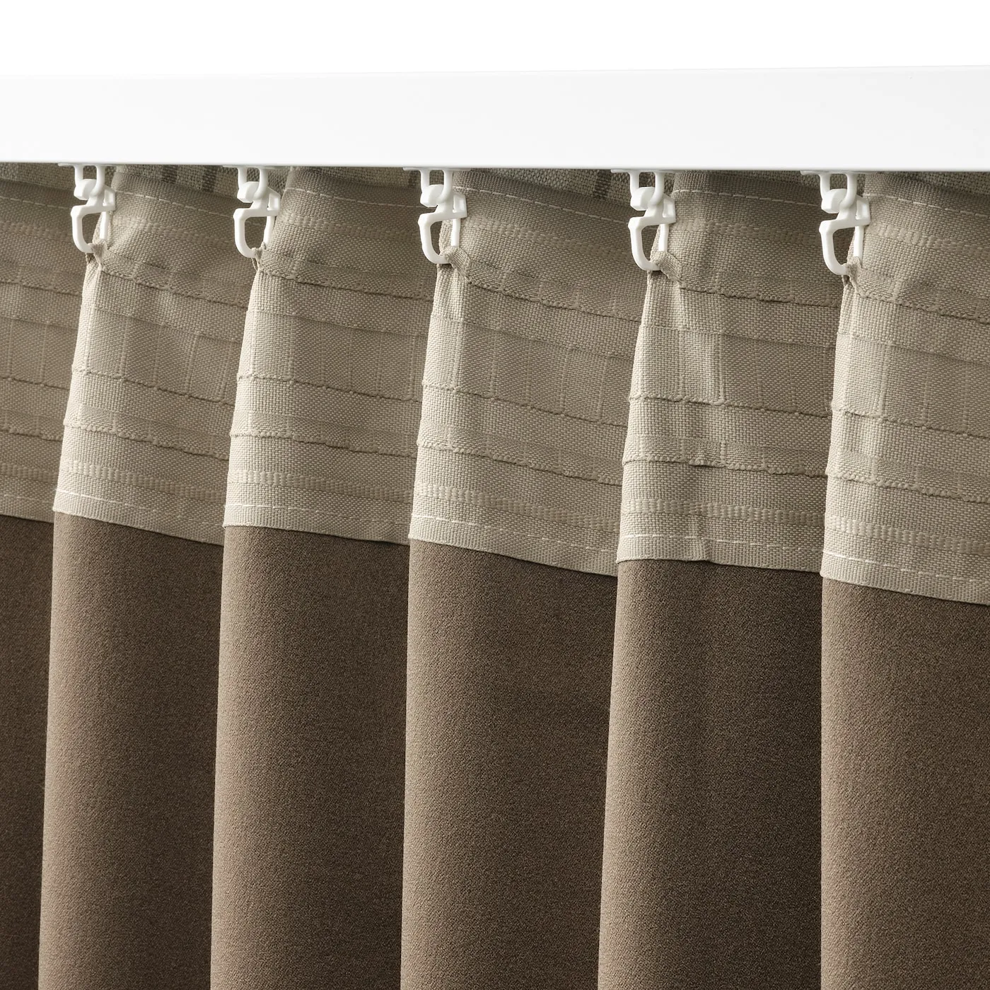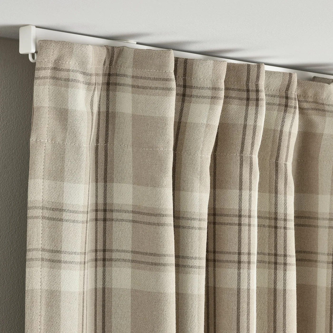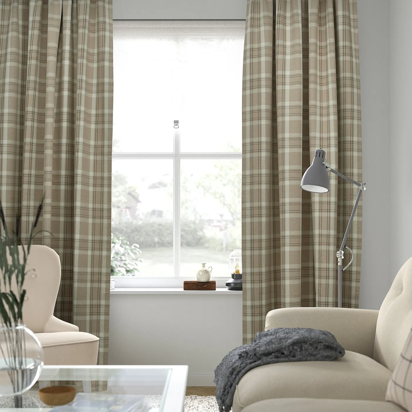 Затемняющие шторы HÄGGVECKMAL с классическим бежевым клетчатым узором, напоминающие шерсть, и подходящей подкладкой обеспечивают хороший уровень уединения. Длина 250 см идеально подходит для установки над окном.