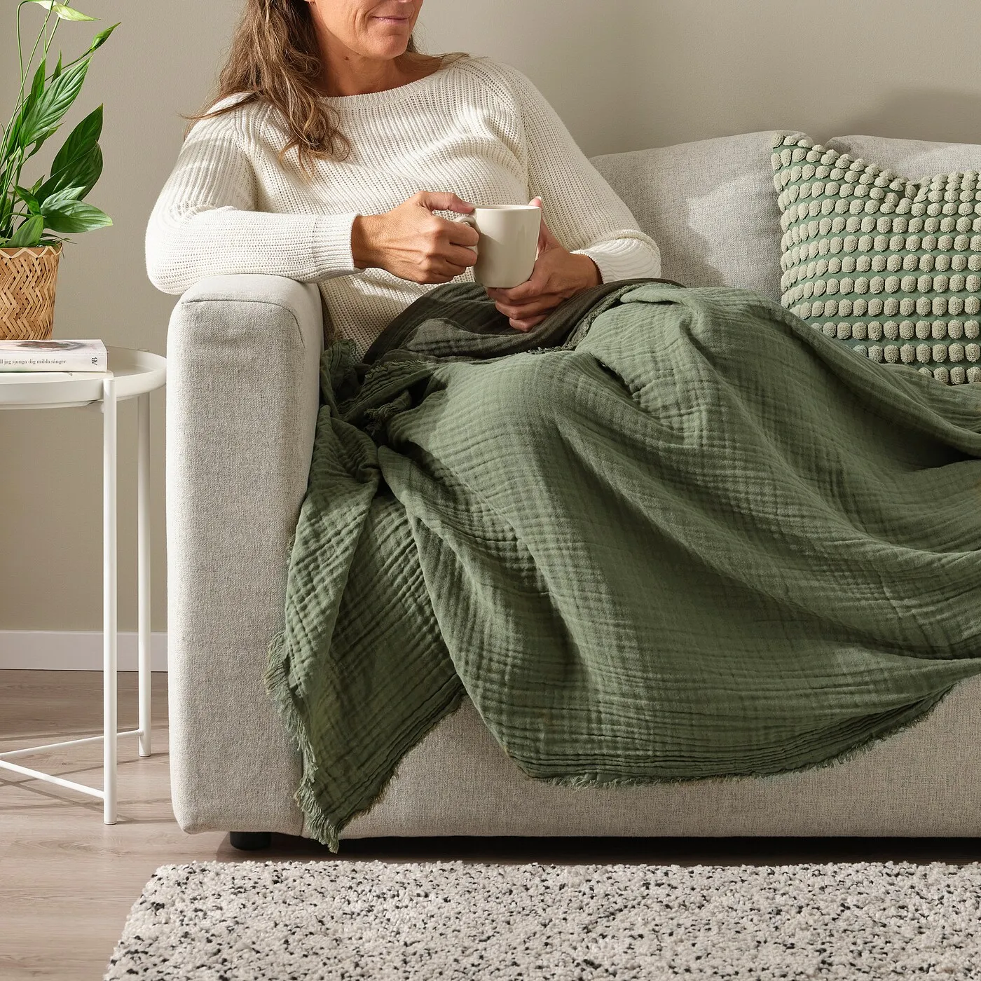 Для создания атмосферы расслабленности накиньте плед VALLKRASSING на диван или кровать. Муслин из сверхмягкого хлопка обладает мятой текстурой, которая идеально сочетается с необработанными краями.