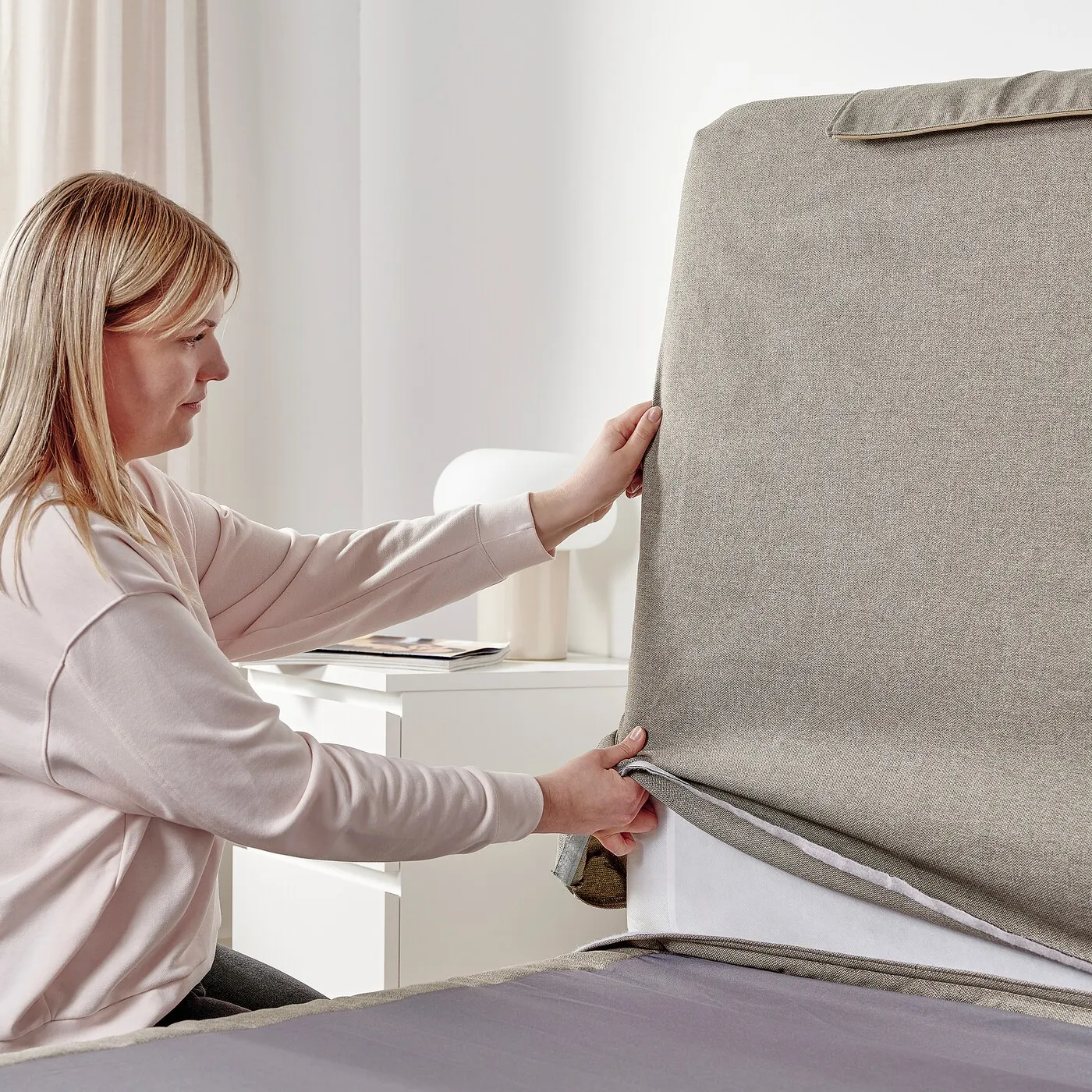 Элегантный чехол для диван-кровати LILLFJÄLLET с местом для хранения. Материал мягкий на ощупь, с легким блеском и сдержанным узором "в ёлочку". Уход за чехлом крайне прост – его легко снять и отправить в стиральную машину.