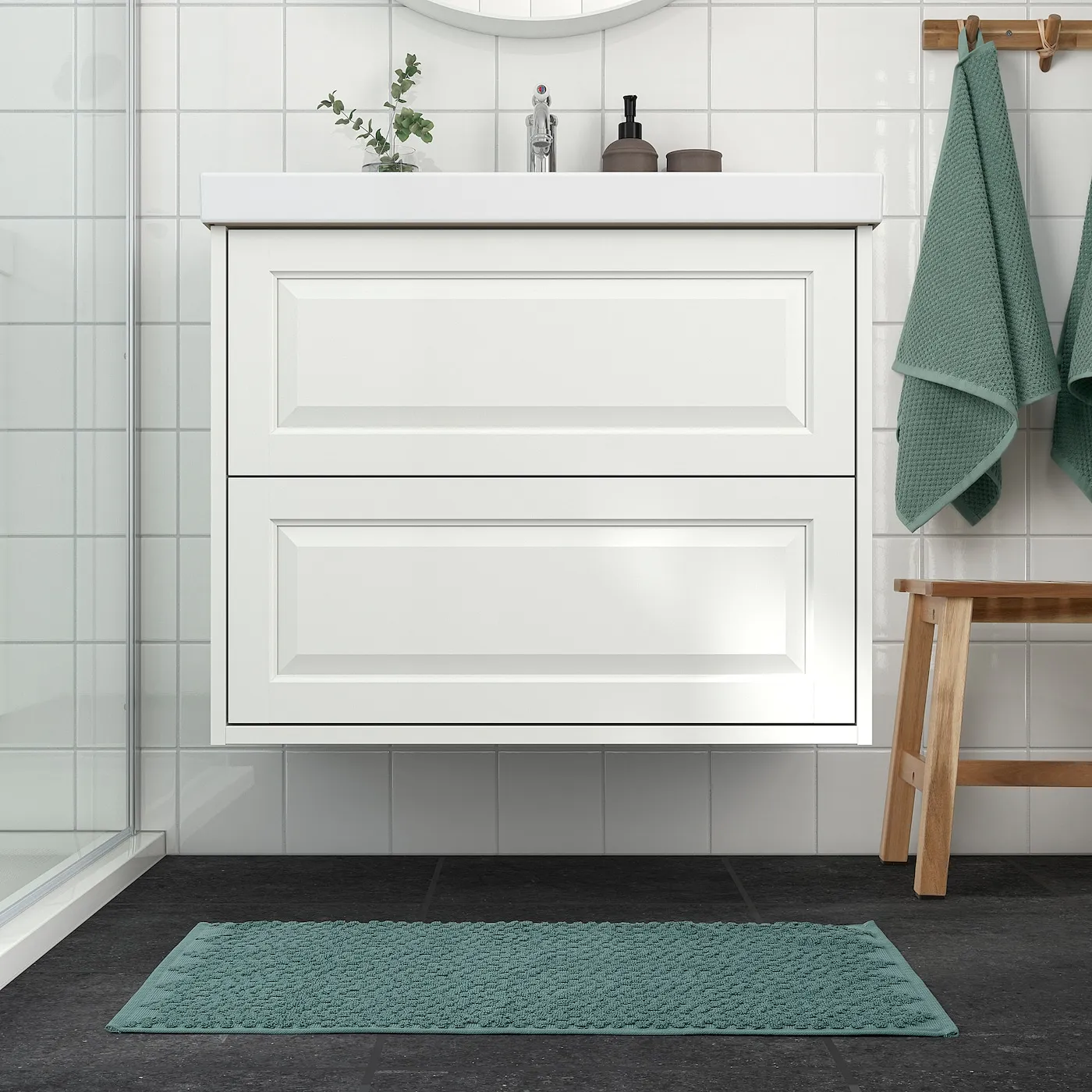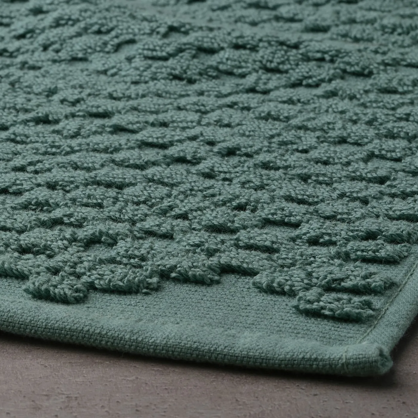 Коврик для ванной FJÄLLKATTFOT в бирюзовом цвете имеет жаккардовый узор, который создаёт неровную текстуру, приятную на ощупь под ногами. Чистый хлопковый махровый материал обладает высокой способностью впитывать влагу и быстро сохнет.