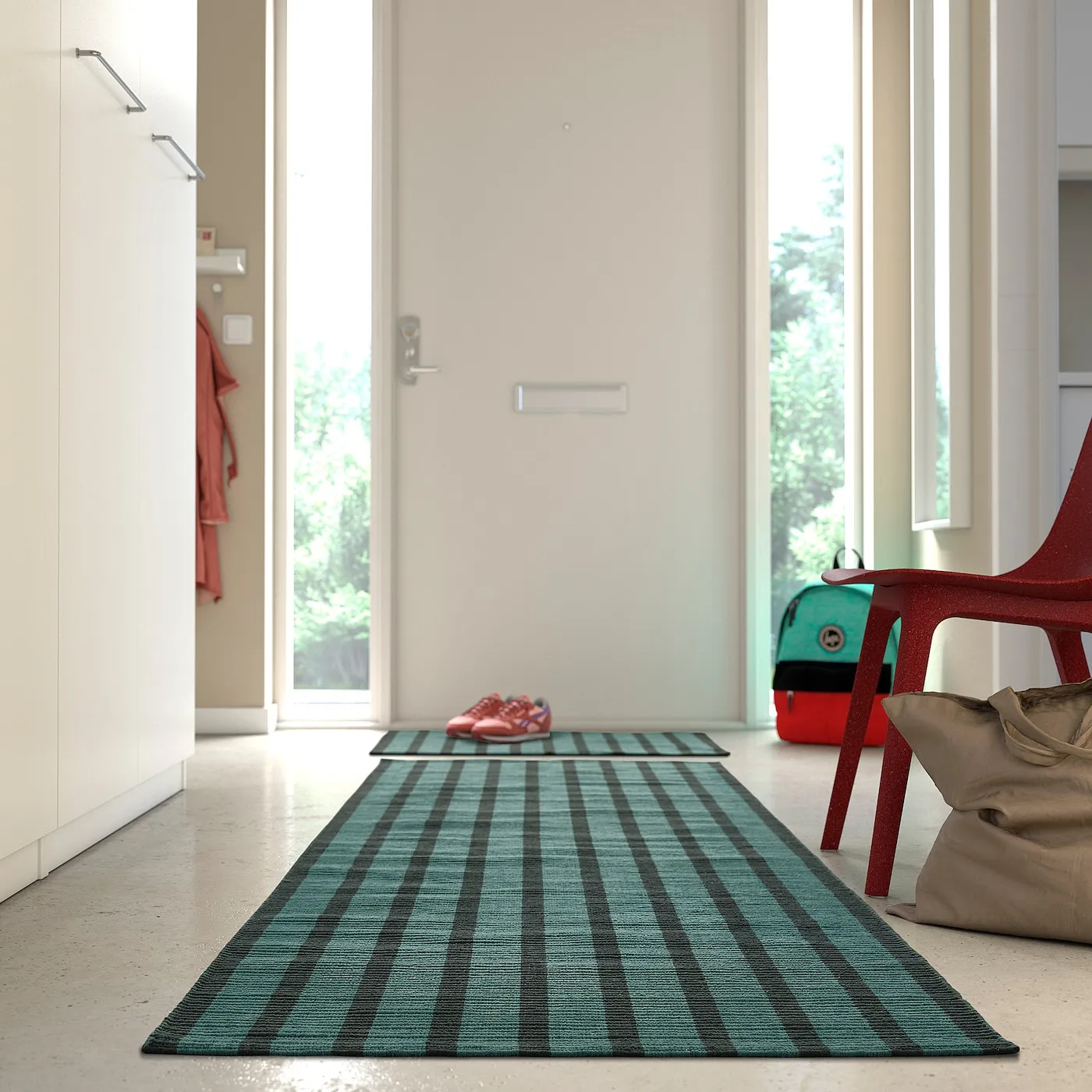 Полосы сине-зелёного и чёрного цветов придают яркость вашему коридору. Сочетайте этот хлопковый ковёр с дверным ковриком VÄGSKYLT, чтобы создать стильный и гармоничный образ.