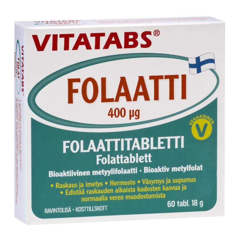 - Таблетки Vitatabs® Folaatti содержат по 400 мкг фолиевой кислоты или фолата (витамин B9). Фолат Quatrefolic®, входящий в состав этого препарата, представляет собой наиболее биологически активную форму фолиевой кислоты (L-метилфолат).