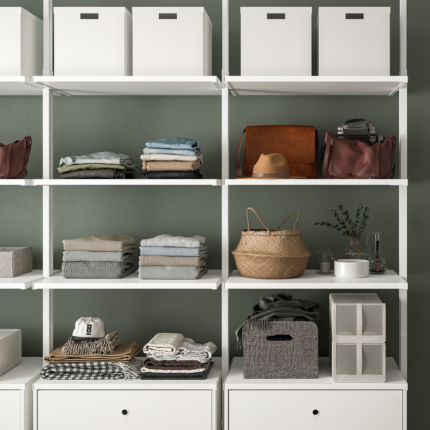 Превратите вашу систему хранения ELVARLI в дом для ваших книг, одежды или прекрасную витрину декоративных предметов. Полки, вешалки для одежды и регулируемая стойка помогут вам максимально использовать ваше пространство от пола до потолка.