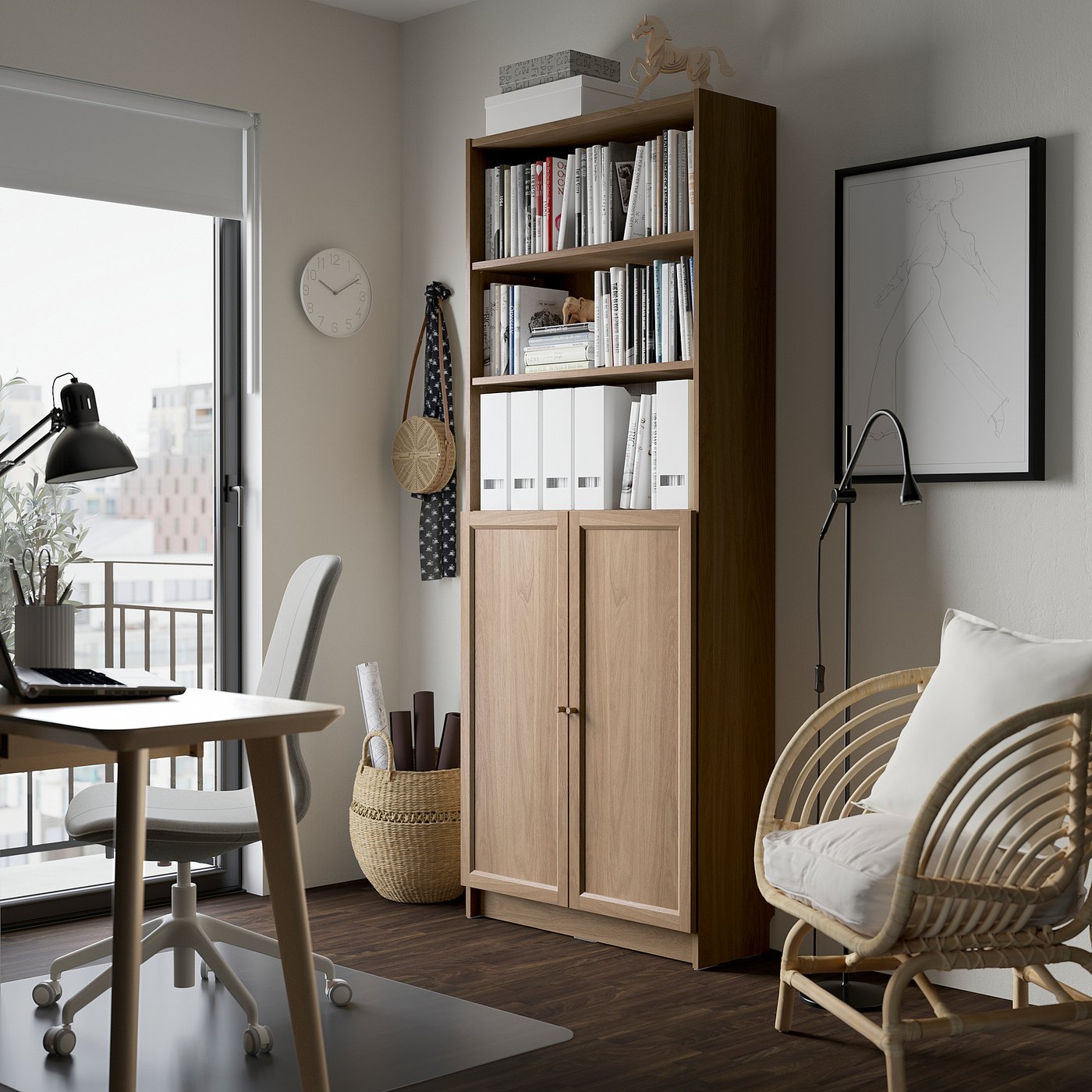 Книжный шкаф BILLY — это любимая икона, которая благодаря своей универсальности может использоваться по-разному. Это решение с панельными дверцами OXBERG предлагает закрытое и открытое хранение — подходит для гостиной и столовых зон.