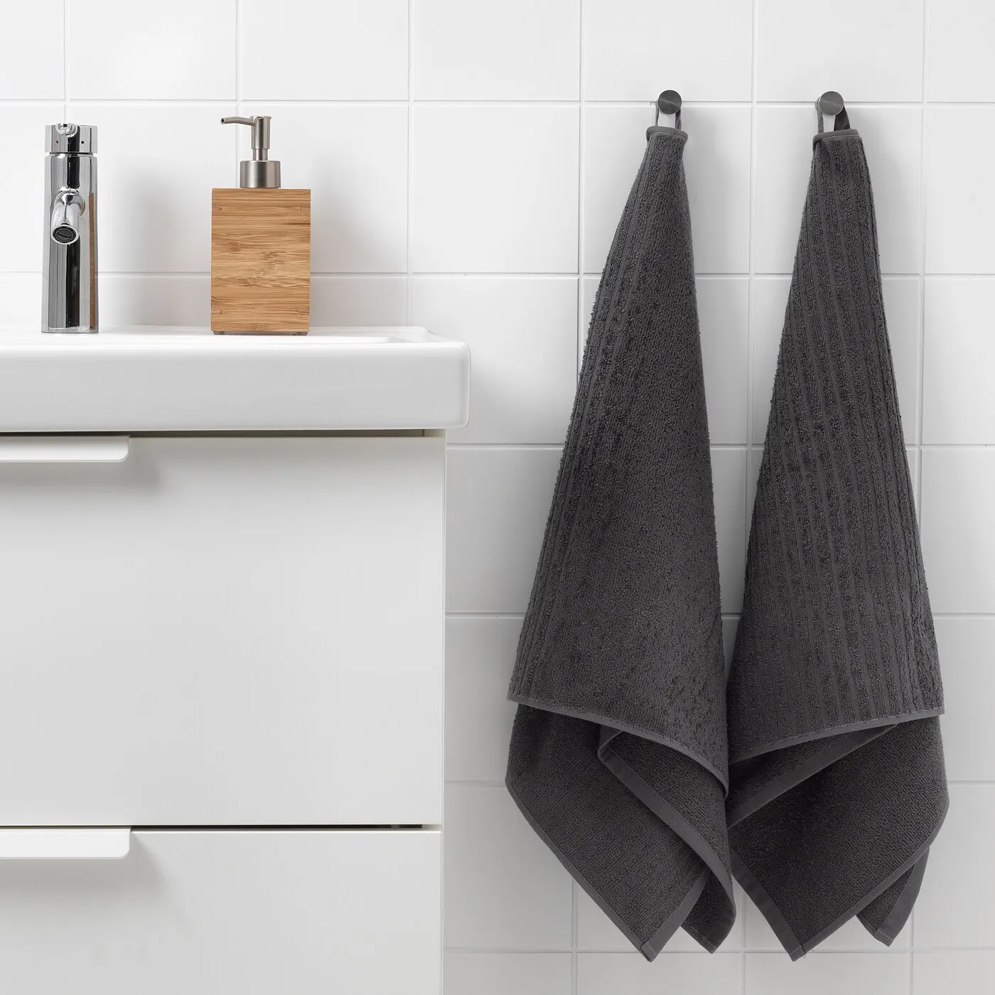 Набор состоит из 2 полотенец для рук и 2 для тела в темно-сером цвете, выполненных из впитывающего махрового материала. Изготовлены из чистого хлопка, который мягкий на ощупь и имеет ребристую текстуру, что придаёт им привлекательный вид и обеспечивает быстрое высыхание.