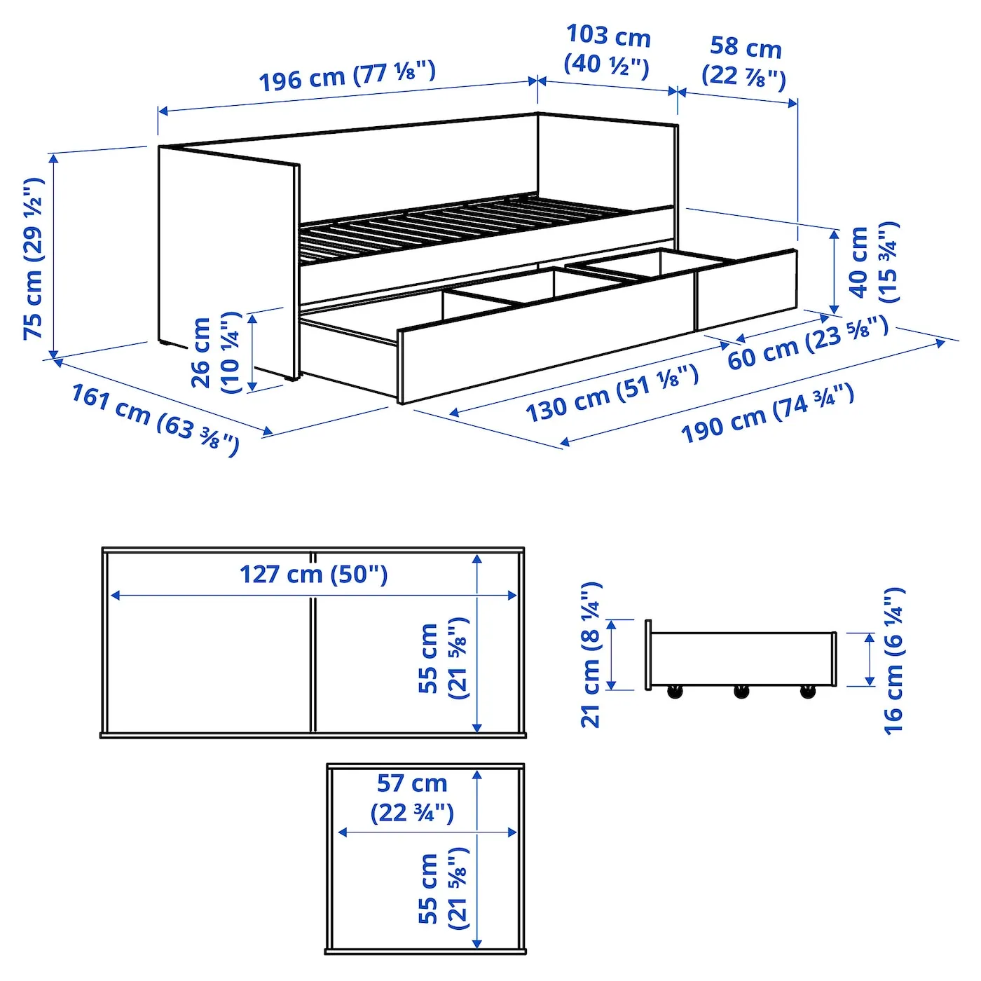 Кушетка VIHALS предоставляет одно спальное место и дополнительное пространство для хранения. Она станет отличным решением для небольших помещений, подстраиваясь под ваши нужды и гармонируя с другими предметами мебели из этой серии.